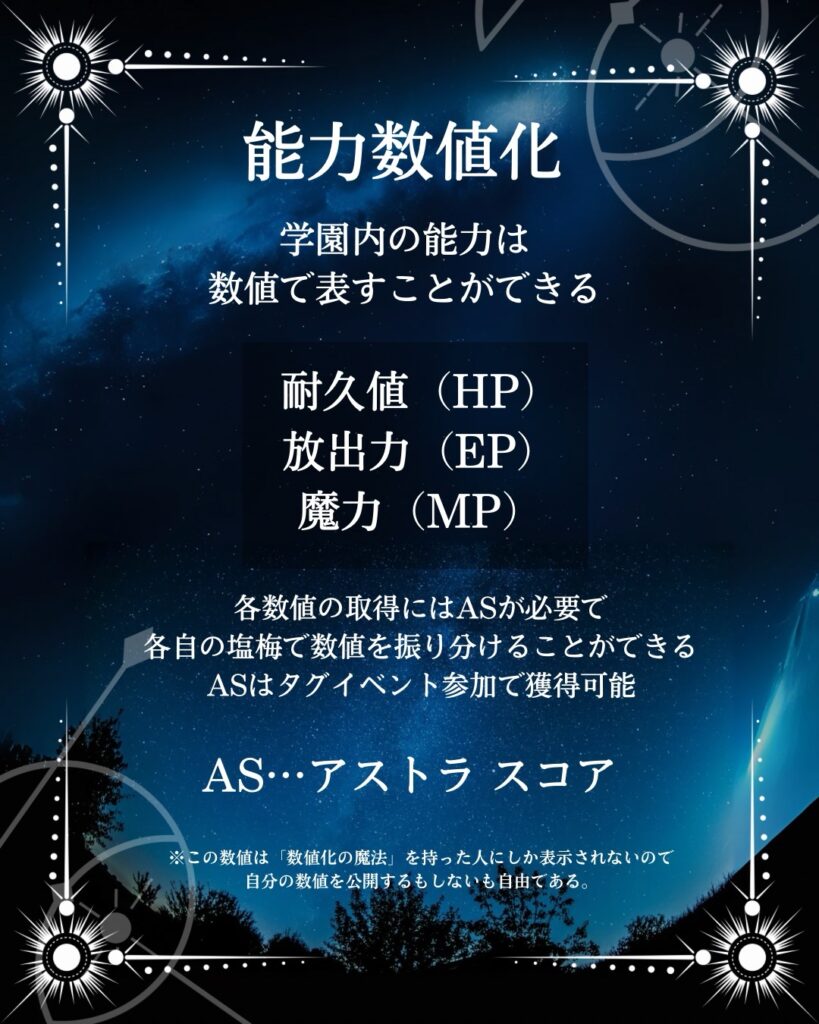 この数値は学園内のキャラクターは明確にわかっているものではなく、中の人が理解していればいいものです。