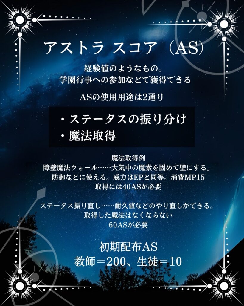 ASは耐久値(HP)、放出力(EP)、魔力(MP)、魔法習得に使うことができます